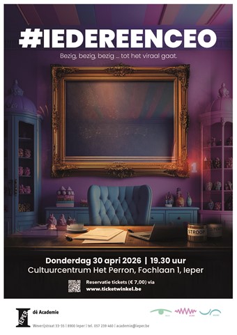 Dé Academie Ieper brengt met #iedereenCEO een eigenzinnige muziektheatervoorstelling vol humor en maatschappijkritiek. Het verhaal speelt zich af in snoep- en chocoladebedrijf De Stroopboerderij, waar CEO Juul na het overlijden van zijn vrouw het familiebedrijf probeert recht te houden. Interne spanningen, familiale breuken en druk van het bestuur lopen hoog op, zeker wanneer zijn broer Jeff hem ondermijnt met een vernederend filmpje dat viraal gaat. Juul wordt ontslagen, maar net dan kantelt het verhaal: werknemers, koor en raad van bestuur zoeken samen naar meer menselijkheid, evenwicht en solidariteit.